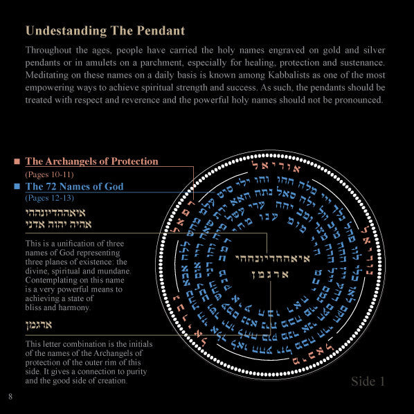 Side 1: The 5 Archangels, Michael, Gabriel, Uriel, Nuriel and Raphael. The 72 Names of God. The Yihud (unification) of the names of God: Three of The Holy names of God unified as one.