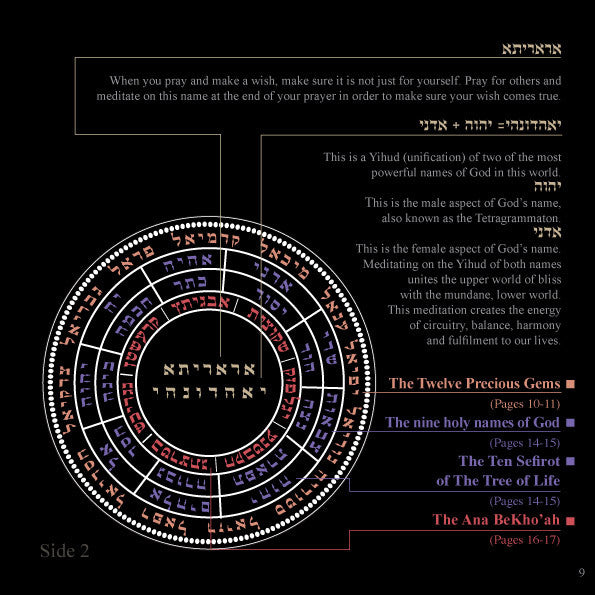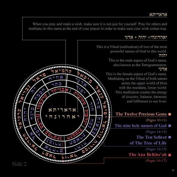 Side 2: The 12 Angels of Protection - The Twelve Precious Gems. The Nine Holiest Names of God. The Ten Sephirot. The Name of 42 Letters - The Ana BeKho'ah. The Holy Name for Prayers. The Yihud (unification) of the names of God, The male and the female aspects as one.